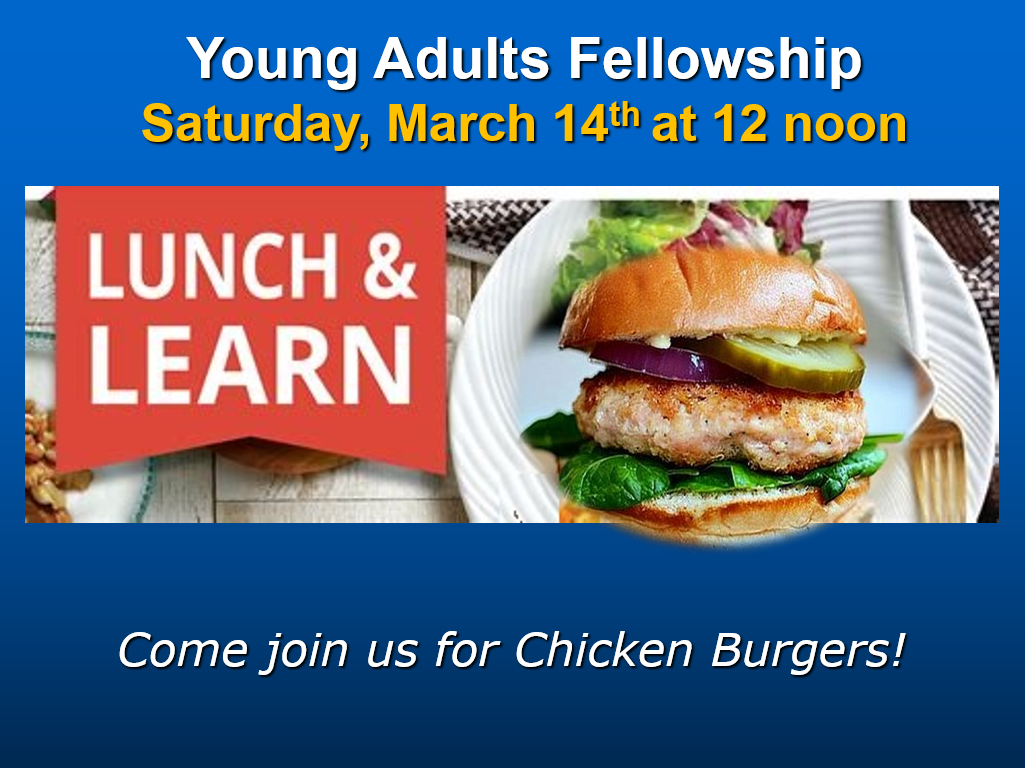 Young Adults Fellowship We normally meet once a week for food, fun & fellowshipCheck our weekly calendar for any special activities, what day, what time, and locations Special events will be posted here and added to the events calendar.